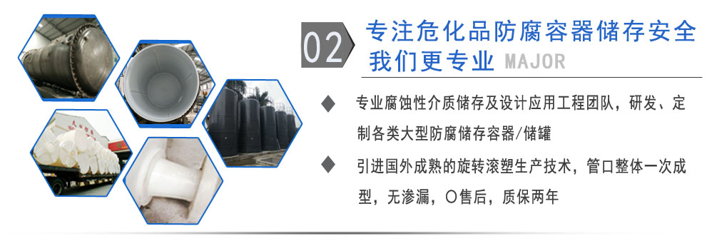 公司有鋼襯塑PE/PO、PE全塑、碳鋼、不銹鋼四大系列100多個品種,專注于常壓儲存容器生產,其產品包括鋼襯塑儲罐管口一體成型PE儲罐、碳鋼儲罐、不銹鋼儲罐、反應釜、攪拌罐、離子交換柱、鋼襯PE/PO儲罐塑料儲罐、鹽酸儲罐、硫酸儲罐等等。更大限度滿足廣大客戶的各種需求,同時可以根據客戶的需要加工定制各種防腐設備。